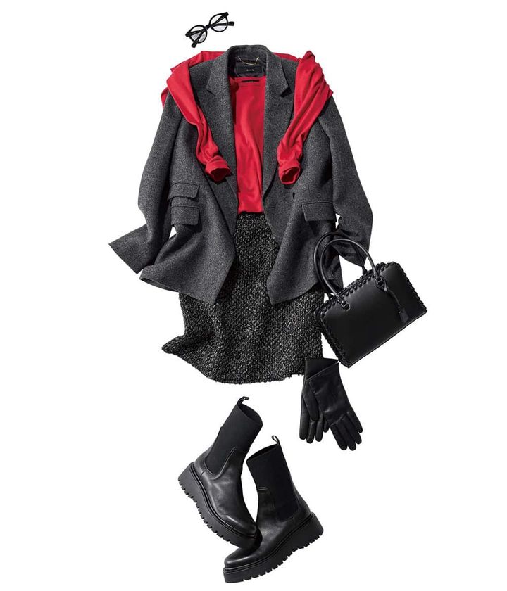 アンサンブル赤ニット × ミニスカートがオススメ! 肩がけがアクセントでJKコーデが最旬に。おじ素材のジャケット、赤以外は「ほぼクロ」に抑えることでミニスカもクリア。