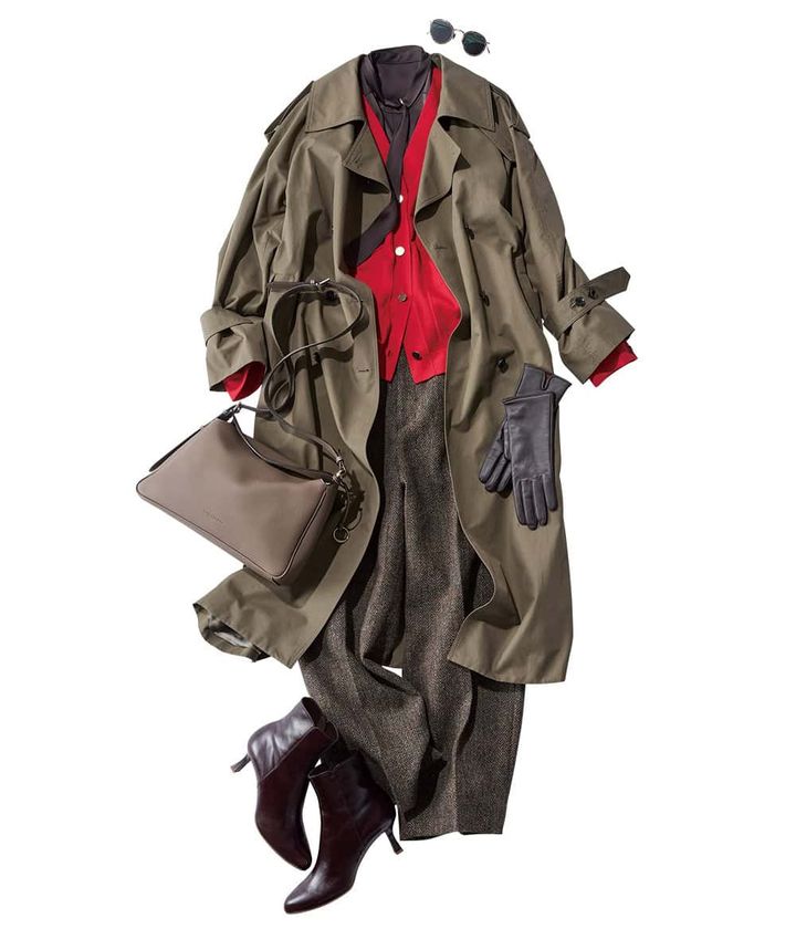 赤カーディガン × アースカラーがオススメ! 構築的な重ね着で洗練されたこなれ感を。似たトーンの色を重ねることでコーデに奥行きが出て説得力UP。