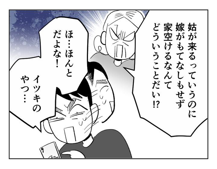 イツキさん、義母が来るのにあわせてホテル生活を始めるとは、なかなかやりますね! コウタさんに腹を立てていたイツキさん、実はビジネスホテルの長期ステイを予約していたそう。出迎えなしどころか、もてなす気ゼロだったのです。青ざめるコウタさん、とてもいい表情をしていますね(笑)。