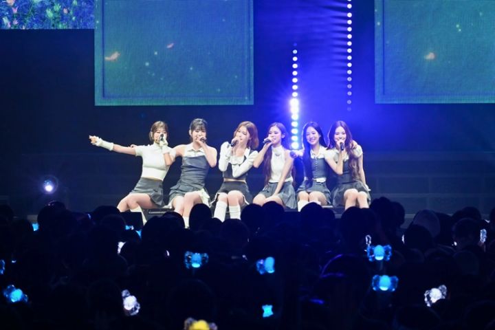 続いて披露したのは、日本でのファンコンサートのために準備したというHANAの『Blue Jeans』。ベンチに腰掛けて、6人がギュッと集まって歌い上げます。