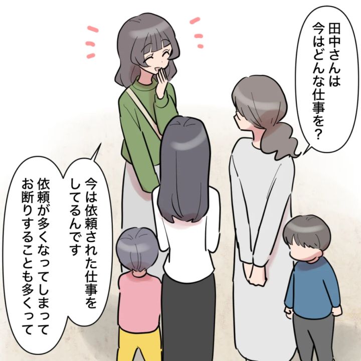 そんな私の予感は残念ながら的中します。田中さんは、新入社員時代から何ひとつ変わっていませんでした。「田中さんは今はどんな仕事を?」ママ友にそう聞かれると、「今は依頼された仕事をしてるんです、依頼が多くなってしまってお断りすることも多くって」と誇らしげに答えます。
