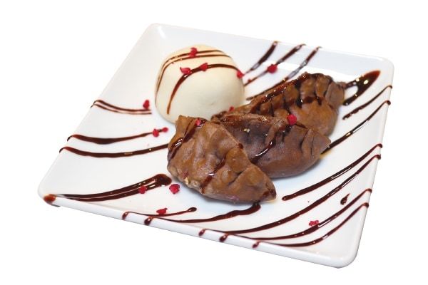 同商品は、バレンタインシーズンに合わせて提供する、餃子の皮をパイ生地に見立てた新感覚スイーツで、チョコフランボワーズ味とブルーベリーチーズ味の2種類を用意。