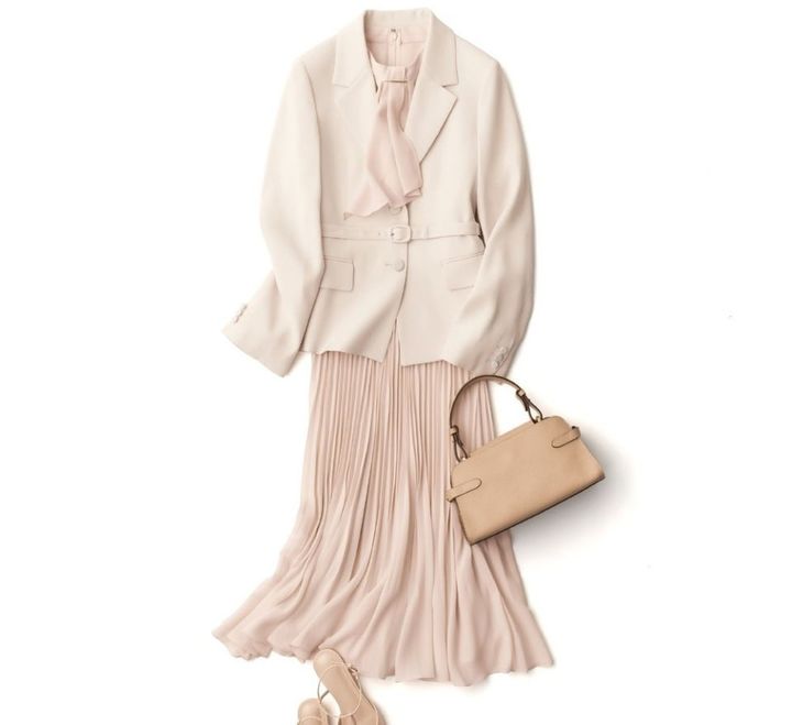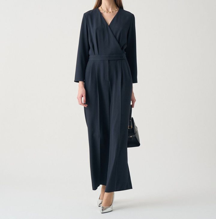 若々しく愛らしいツイードのジャケットなどももちろん素敵なのですが、ここでは普段カジュアルであまりセットアップには慣れていない40代にオススメのアイテムをご紹介していきます。まず一着目は、オールインワンです。エレガントで上質なトリアセテート混のバックサテンジョーゼットのジョーゼット面を表地に使用しているので、素材からもうオケージョン感が漂います。これが重要ポイント。式典で同じようなカラーのアイテムを着用した方が並ぶので、まず素材の良し悪しが歴然としてしまうんですよね。