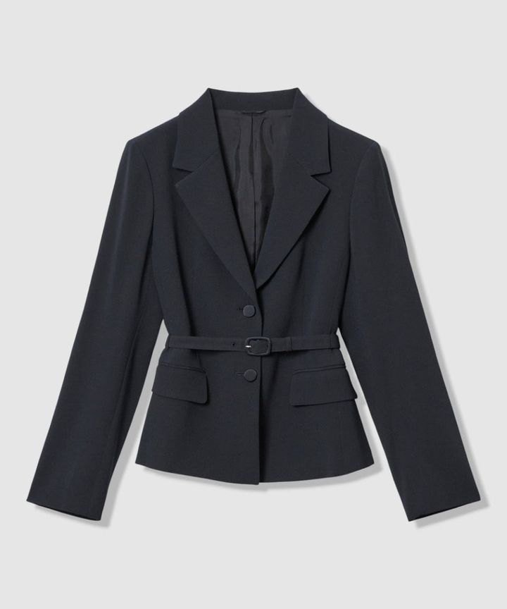 先ほど紹介したオールインワンと合わせて着用もできる同素材のジャケットです。これ、めちゃくちゃ軽くて肩まわりの窮屈さがまったくなく動きやすく、着心地がラク。パンツにはもちろん、スカートやドレスとのスタイリングもしやすいように、やや短めの着丈になっているそう。ウエストはそこまでシェイプされていないので、ベルトを外せばストンとしたシルエットを楽しむこともできます。