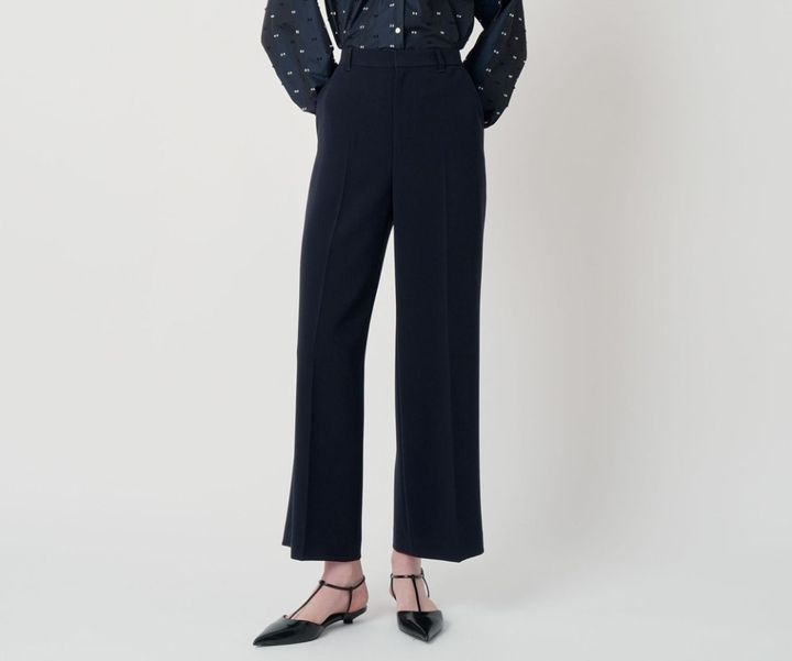 こちらのパンツもトリアセテート混の上品な質感で、ストレッチのあるダブルクロス素材を使用。程よい生地厚と落ち感があり、窮屈さゼロ。太すぎない美脚ラインにこだわったというストレートシルエットのワイドパンツです。画像は外国人モデルの方で着丈が短めに見えていますが、166㎝の筆者が36サイズをはいてもくるぶしまでしっかり隠れる長さがあり、バランスよくはけました。高身長の皆さんでも安心して着用できる点もオススメです。