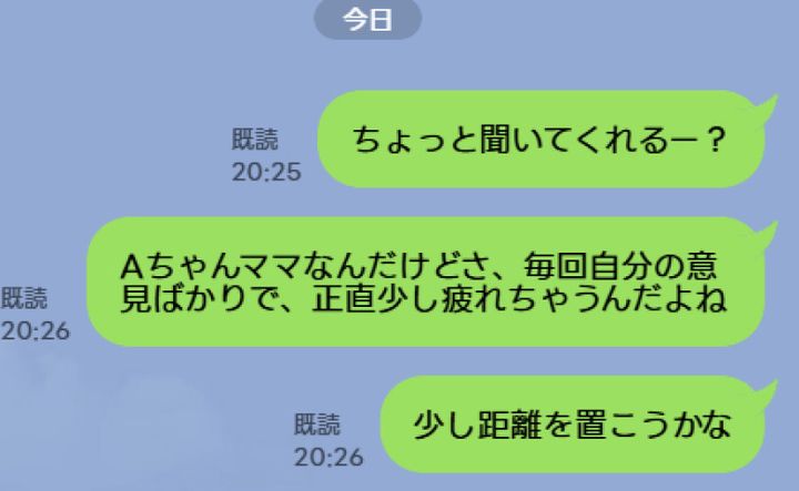 「Aちゃんママなんだけどさ、毎回自分の意見ばかりで、正直少し疲れちゃうんだよね。少し距離を置こうかな」