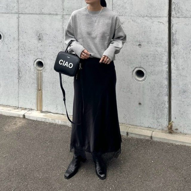 ベーシックな「黒のサテンスカート」には春らしいトップスを合わせるのがおすすめ。スナップのようにスウェットやデニムシャツとの組み合わせは、コーデのマンネリ解消にも効果的。足元がブーツでも時期外れには見えず、2月3月の装いにマッチします。
