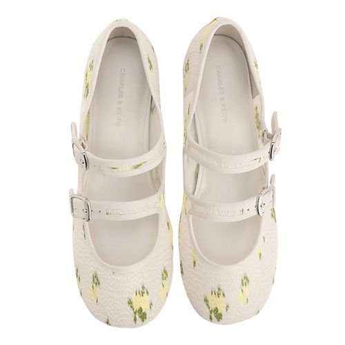 アイボリー花柄シューズ(0.2) 30,800円/TSURU By MARIKO OIKAWA シワ加工を施したアッパーが白のぺたんこ靴をよそいきに。不揃いのイエローとグリーンが入ることで、白に洒落感がそなわり履きやすく。ダブルストラップはマジックテープ式で着脱も簡単。