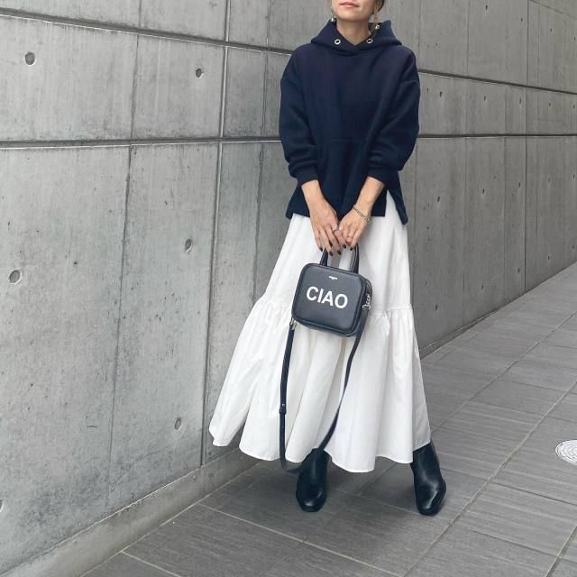 【2026年2月11日のコーデ】パーカー×白スカートって簡単なのにおしゃれに見える♪