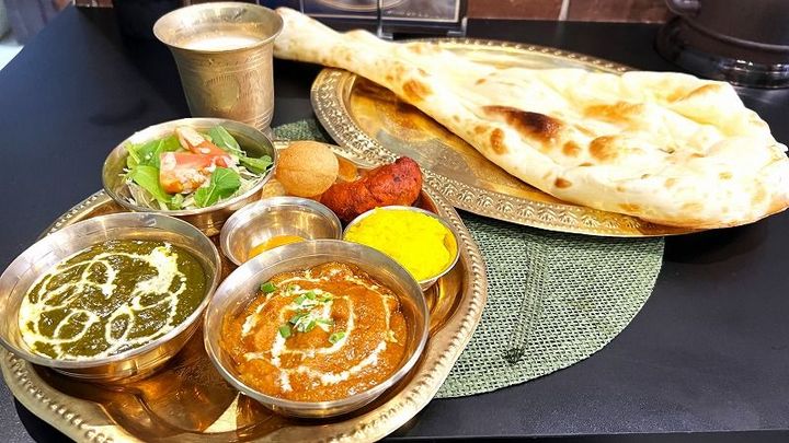 まず、玉ねぎベースの「チキンカレー」、ほうれん草ベースの「キーマシャグ」という2種類のカレーが味わえるほか、タンドリーチキン、トマトベースのソース、サラダ、ライス、“プリ”という、豆の粉で作った丸い形のお煎餅のようなもの、ラッシー、さらにナンまで!