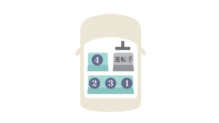 運転席の真後ろがお客さまや目上の人の座る上座。4人で乗るなら次に助手席の真後ろ、後部座席の中央、助手席となる。ふたりが乗車する場合は目下の者は助手席に座る。