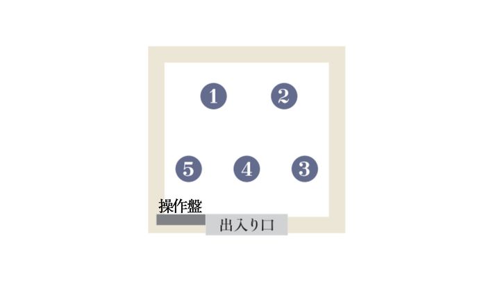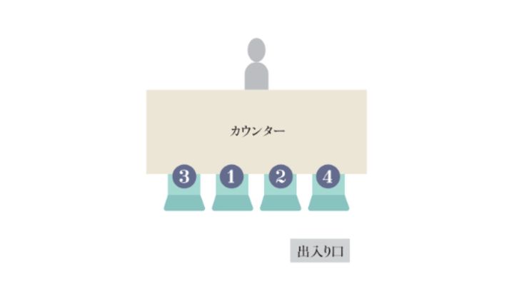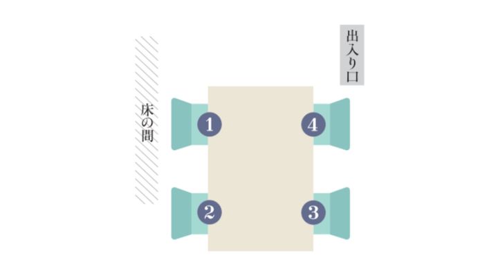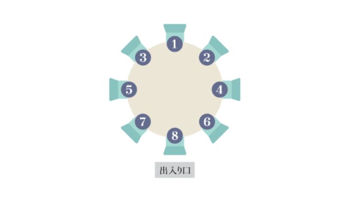出入り口から最も遠く、壁を背にした席が上座。上座から見て左、右の順が席で、出入り口に最も近い席が下座となる。