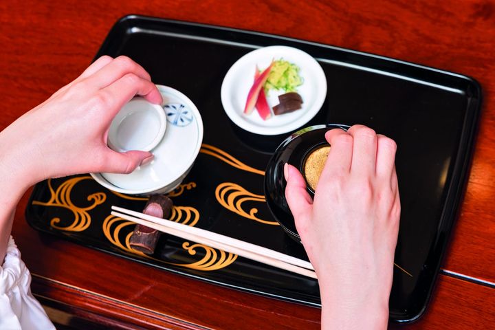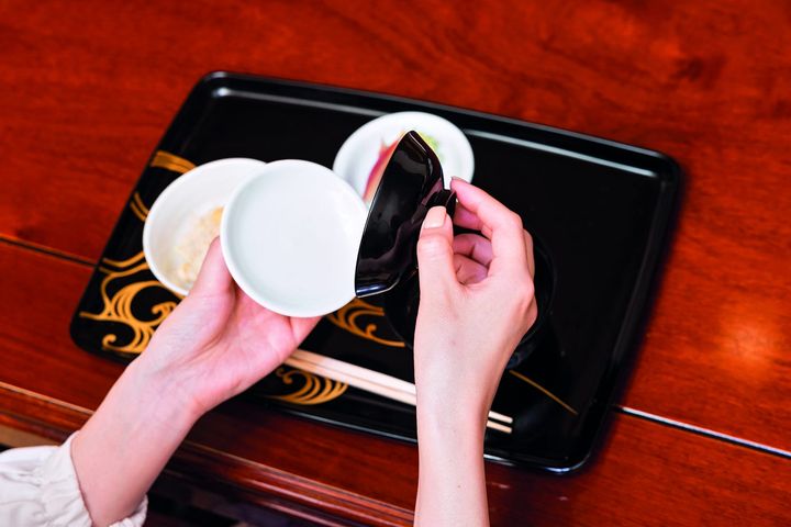 食事中は折敷の外右横中央あたりに置く。煮物椀など裏側に蒔絵などがある蓋は、糸底を下にして折敷の外に置く。
