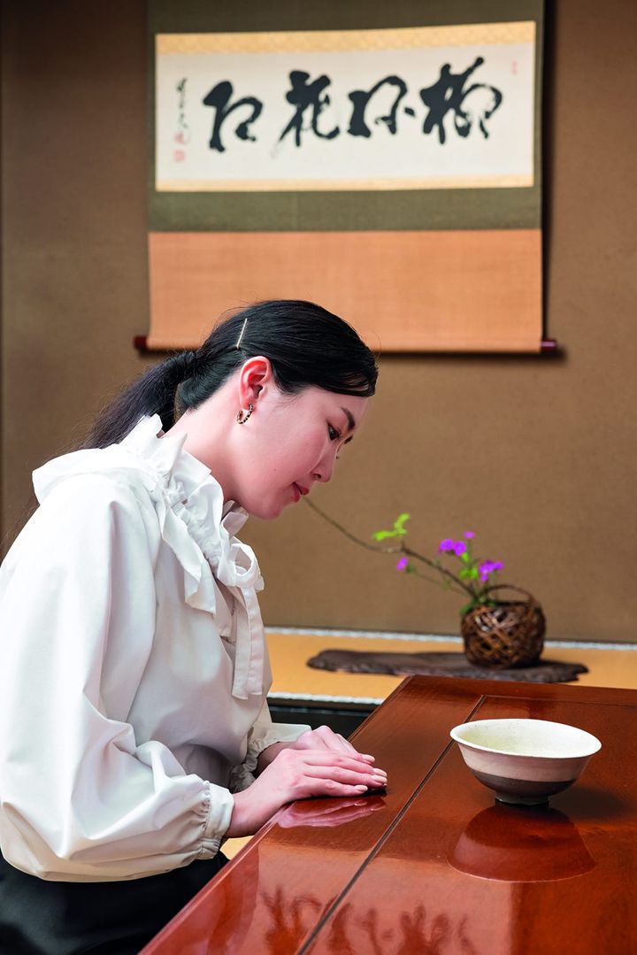 茶碗を持ち上げて感謝し、飲み口の正面を避けて口をつけるのがマナー。