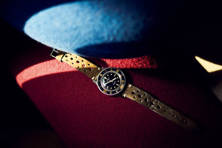 〈ブランパン〉が1953年に発売した世界初のダイバーズウォッチ「フィフティ ファゾムス」の初期モデルも愛用。