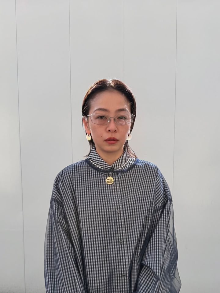 「モノトーンカラーを軸に、チェックシャツ、チュールトップ、サテンスカートと、それぞれ存在感のあるアイテムを組み合わせました。ワントーンでまとめつつも、素材感で奥行きが出るよう意識しています。レディライクな要素が強い分、全体が甘くなり過ぎないようにアイウェアでシャープな印象をプラスしました」