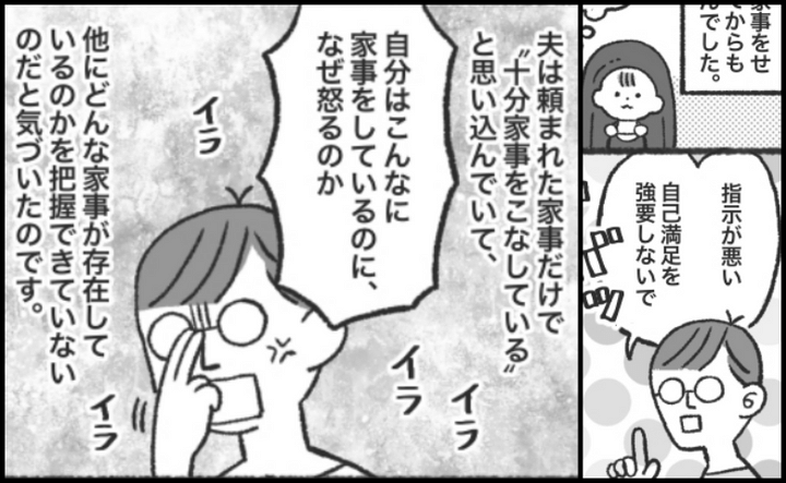 もっと家事してほしいと訴えると、「指示が悪い」「自己満足を強要しないで」などと言い返され、そのたびにけんかを繰り返す私たち。