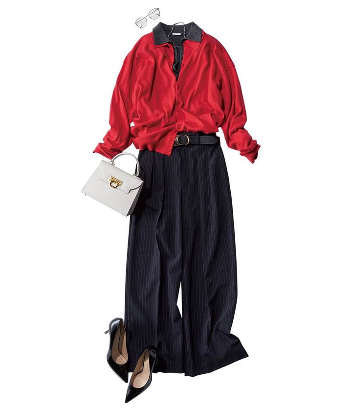 衿つき赤ニット × ワイドパンツがオススメ! 衿つきニットを重ねて好感度と知性を両立。2枚の衿をレイヤードする上級コーデ。