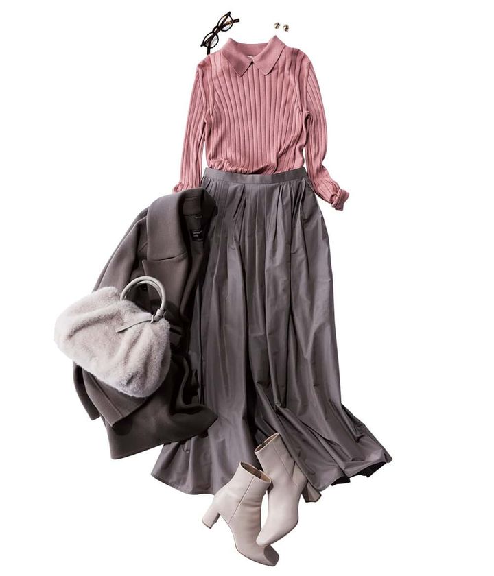 きれいめピンク × 優しげカラーがオススメ! 甘コンサバでシーンレス衿つきニットで更新感。ボリュームフレアスカートも全体の色味を抑えた柔らかトーンなら今っぽく親しみやすさもUP!
