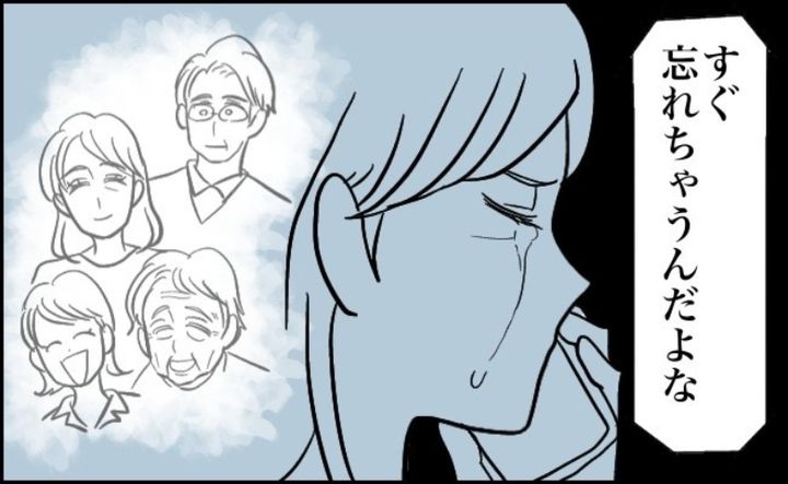 「切なくて涙が出るんだけど」と言うと、兄はそれをそのまま母に伝えますが、母は「そうなんだよ、すぐに忘れちゃって切ないんだよ」と笑っていて、会話も的外れ。心配して電話をかけたことも、母の喜びそうなものを送ったことも、母はもう忘れているんだろうか。もしかしたら、母を喜ばせたくて新型コロナウイルスの前によく連れて行った旅行のことも、孫たちと一緒に過ごした思い出も、全部記憶から消えるのかもしれない……。そう思うと寂しさと虚しさが込み上げて、涙がこぼれました。
