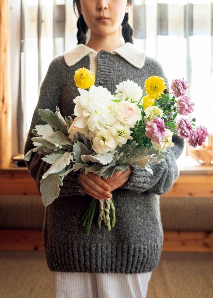 『ル・ベスべ』の松岡龍守さんが選んでくれた今月の花は、花先が尖った剣弁、ラウンドした丸弁の白いダリア2種。ラナンキュラスを合わせて、ピンクやグリーンがかっているもの、イエロー、パープルなど色とりどりに。一足先に、花いっぱいの春の喜びを表現した。「先日、生産者の視察でアメリカ・シアトルへ。立ち寄ったマーケットへの道すがら、ダリアの束を抱えたカップルに次々とすれ違って。彼ら彼女らは皆はじける笑顔で、幸せいっぱいの様子。市場にずらりとダリアが売っていたんですね。『ああ、花がある風景って最高』と、開業29年目にして初心を思い出したのでした」(ル・ベスべ 03−5469−5438) ニットポロ¥71,500(アー・ペー・セー カスタマーサービス 0120−500−990) パジャマパンツ¥28,600(コンテンポ/ヤエカ ホーム ストア 03−6277−1371)