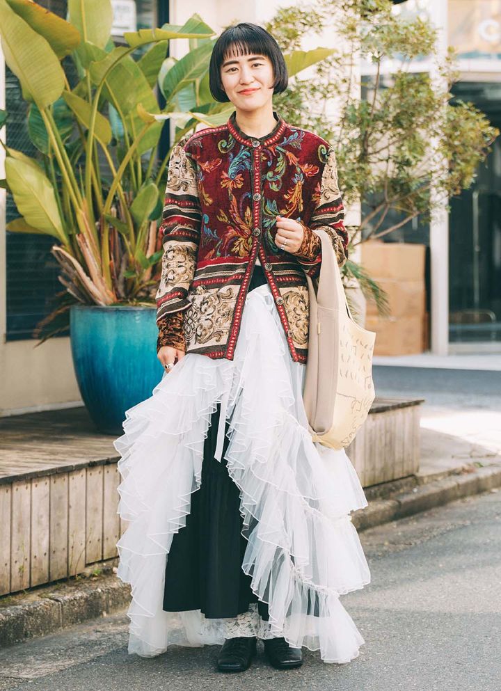 ブラックレザーのシューズで甘めコーデを引き締めて。すっきりしたシルエットでボリューミーなボトムスとも好バランス。