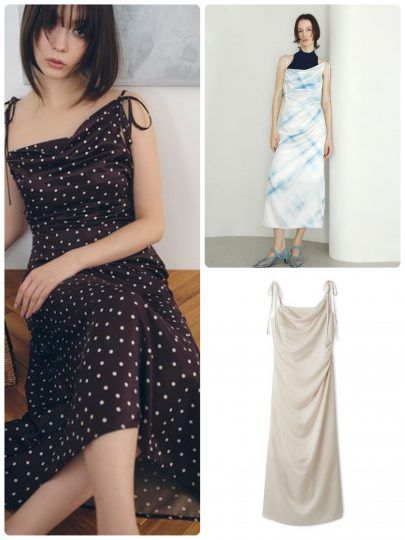 トレンドのランジェリーライクなキャミワンピは、カジュアルなアウターやマニッシュやジャケットなど、あえて正反対をいくアイテムとのミックスコーデが推なんです。デニムとのレイヤードもおすすめです。ボトムと組んで、トップス感覚で使いやすい丈感もポイント。こちらはドット、ライトブルー、ブラックの3色展開です。