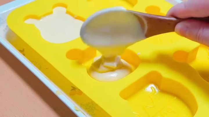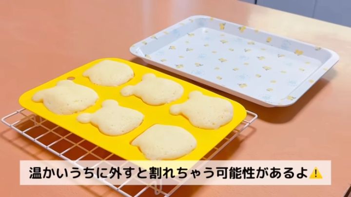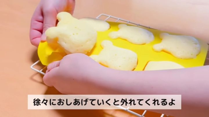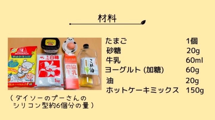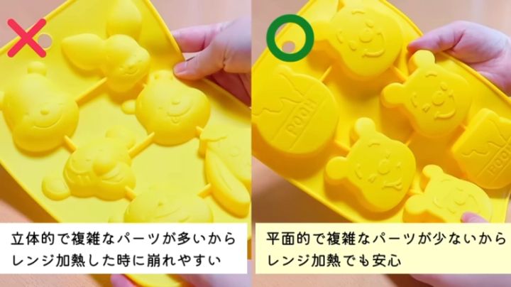今回はダイソーのプーさんのシリコン型を使っています。(6個分/電子レンジ対応)。丸みがあったり立体的で凹凸が細かかったりするシリコン型は、加熱した際に崩れやすかく、熱が均一に入らないため、できあがりの表面が平らになるような平面的な型を使いましょう。プーさん以外の型を使う場合も同様に平面的な型を使いましょう。