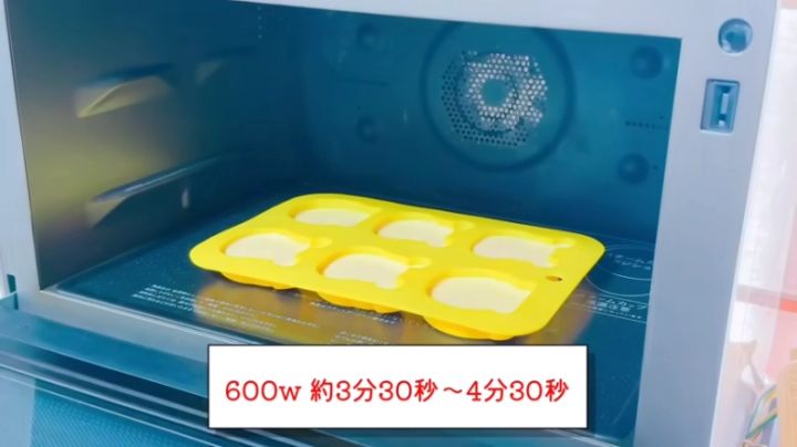 型に生地を入れ終えたら何回かトントン落として空気を抜き、600Wの電子レンジで約3分30秒~4分30秒加熱します。