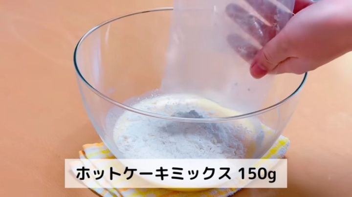 ボウルにホットケーキミックスを入れて、泡だて器で手早く混ぜます!
