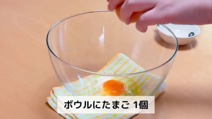 耐熱ボウルにたまごを割り入れ、泡だて器でよくほぐします。