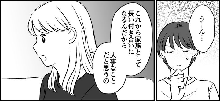 私はイノリ。夫のショウと6か月の娘マホの3人暮らしをしています。義母の誕生日会で無銭飲食をした義弟にモヤモヤしていた私。母は、「自分が頑張りすぎているからイライラするのではないか」と指摘してきました。それを聞いて、私はなんだか納得してしまいました。ショウが気にしていないため今後どうするべきか相談すると、母はふたつのアイデアを提案してくれました。ひとつはお祝いのグレードを下げること、もうひとつは義弟夫婦と折半のお祝い会にすること。そして、ひとりで抱え込まず、ショウに正直な気持ちと具体的な案を伝えて話し合うべきだとも助言してくれました。母の言葉で、私の心は少しだけ軽くなった気がしました。