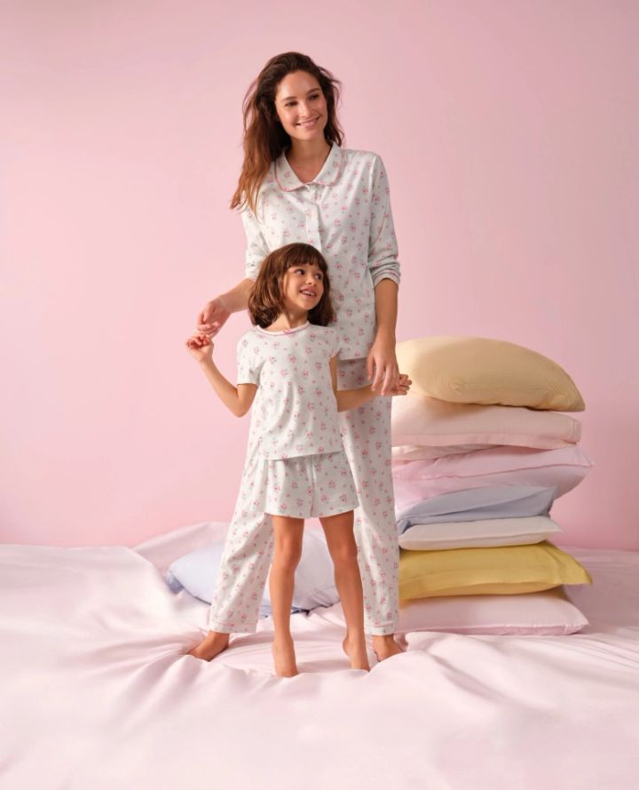 こちらは、ストライプの上に小ぶりなフラワーがプリントされたパジャマと、ミントグリーンなどのパステルトーンがカラーパレットのように配色されたパジャマのセットアップ。早くお風呂に入って、おそろいのパジャマにお着替えすれば、夏の夜のファミリー時間が楽しく満たされそう!