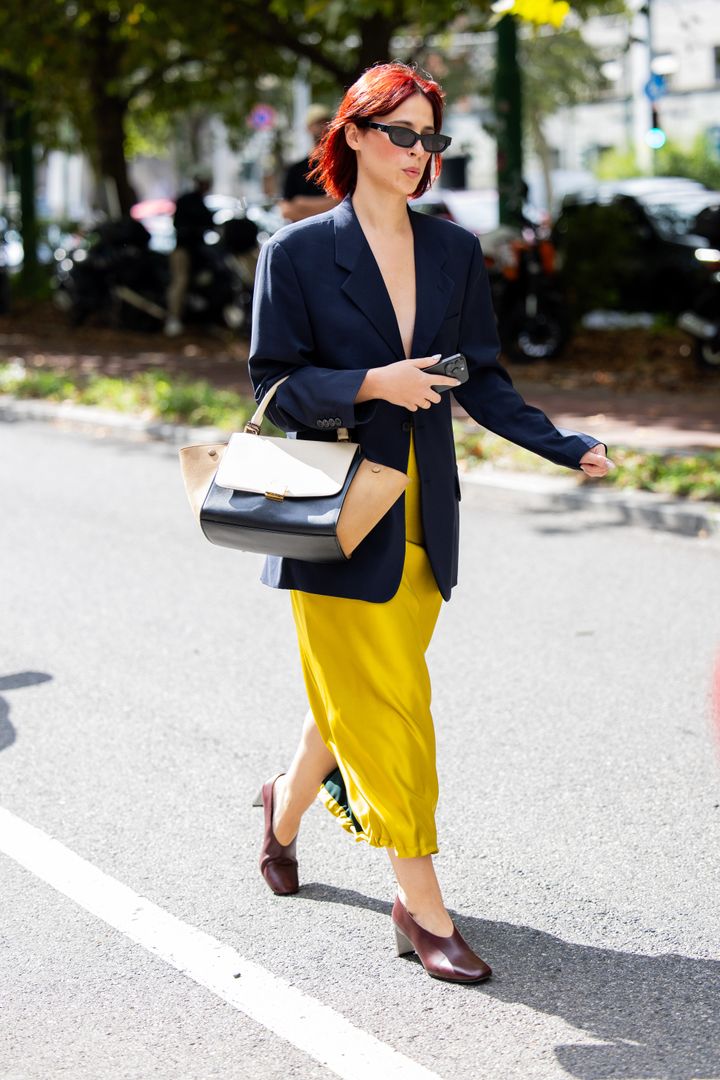 シャルトルーズ(黄緑)やバーガンディは、ネイビーと好相性のトレンドカラー。サテンのつややかな質感がダークブルーのテーラリングに美しく映え、大胆な色選びも洗練された雰囲気をキープしてくれる。