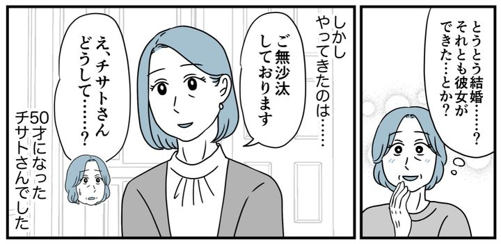 そんなある日、タツヤが珍しく長期休みでもないのに実家に来ると連絡してきました。しかも会わせたい人がいると……。良い話が聞けそうで、私は心が躍りました。しかし、やってきたのは……15年ぶりに会うチサトさんでした。