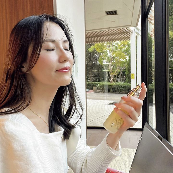 もともと皮膚が薄く刺激を受けやすい敏感肌。乾燥や摩擦も肌が過敏になる要因だから、日頃から守りながら整えるケアをしています。私が実践しているのは、浸透力が高いオイルで24時間保湿すること。朝のブースターオイルセラムから始まり、日中はメイクの上からも使用できるオイルインミスト、夜は顔やボディ、ヘアにも使えるマルチオイルでフィニッシュ。このルーティンを続けることで、一日中乾かない安定肌が続くように。