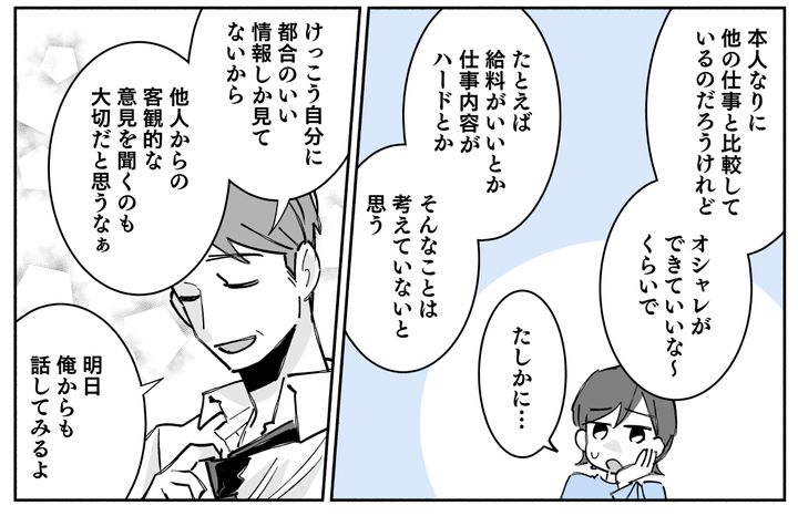 「結局決めるのはハルナだから、そこを反対するのは違うかもね。でも今は自分に都合のいい情報しか見えていないから、他人からの客観的な意見を聞くのも大切だと思うなぁ」と旦那は言います。