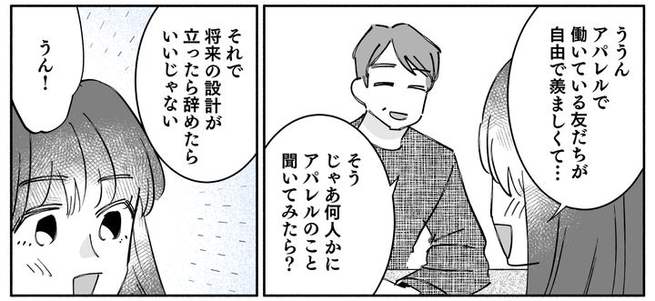 旦那とハルナが話をしています。今の仕事を辞めることを反対はしない、ただ、次のことを考えてから辞める方がいい。そしてもし、やりたいことが決まっているなら、まずはその業界の人の話を聞いてみるといいよとアドバイス。旦那の言葉にハルナは嬉しそう。
