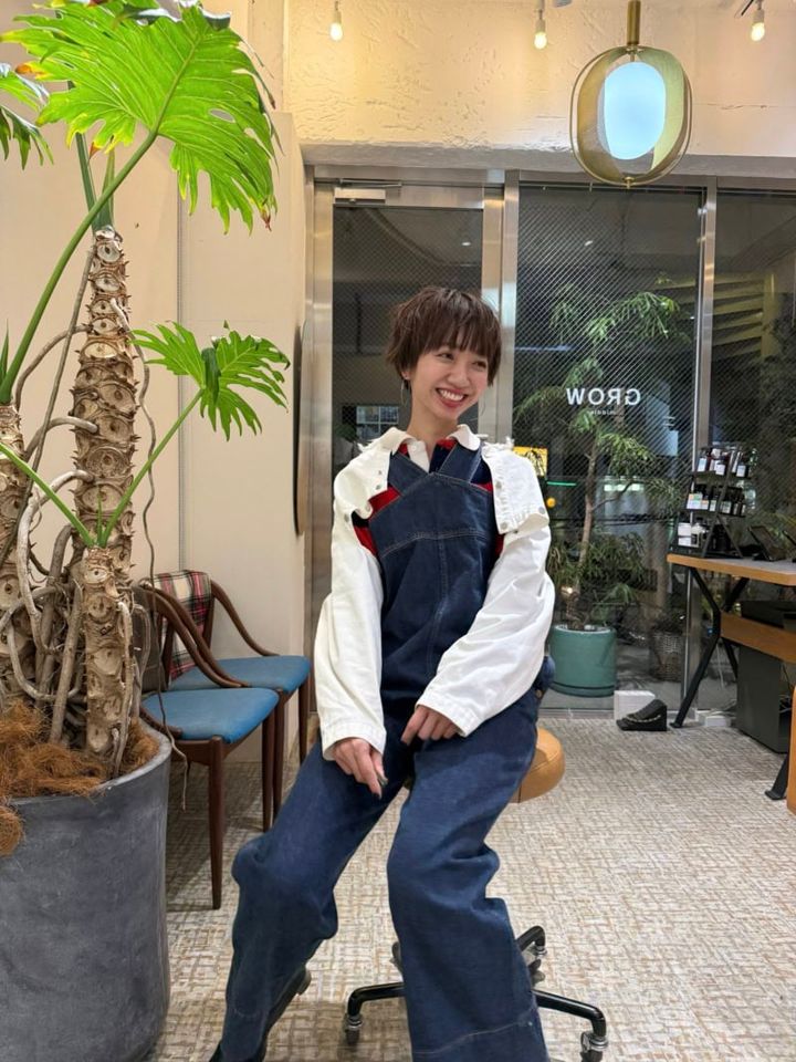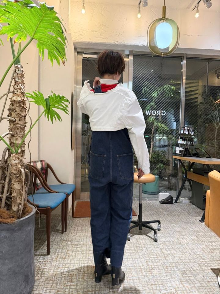 「クリーンな白のショート丈ジャケットをオールインワンに重ねて、視線をアップ& 脚長効果も意識しました。インには流行りのポロシャツをレイヤード。春に向けて、ホワイトや赤だったり、明るいカラーをどんどん取り入れていきたいです」(美容師・丸岡奈央さん)