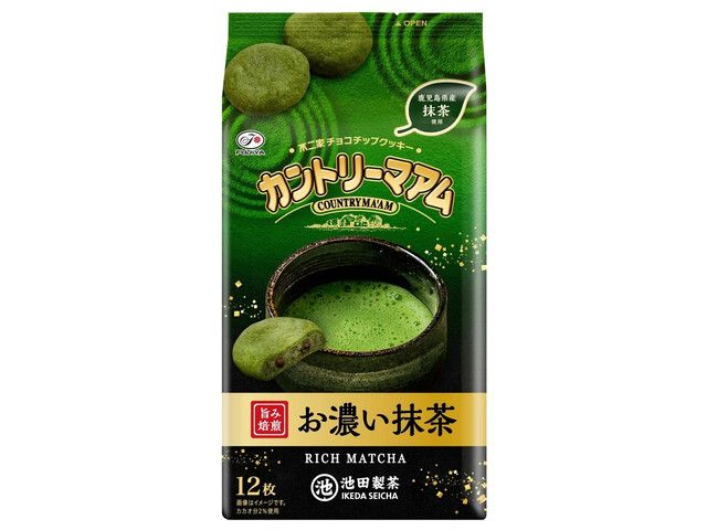 ・甘みと渋みの調和のとれた、濃厚でコクのある鹿児島県産抹茶を生地に練り込み、チョコチップを合わせて焼き上げたカントリーマアム ・抹茶のほどよい苦味と奥深い味わいが愉しめる期間限定商品 ・茶師十段池田研太氏監修 ・創業78年の老舗茶商「池田製茶」の抹茶を使用