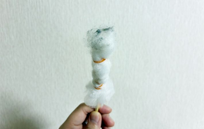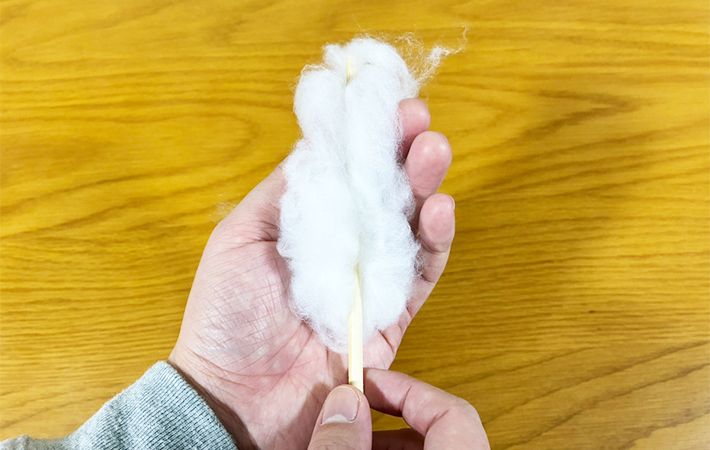 まずは下準備です。手芸綿を必要なぶんだけちぎり、割り箸に巻きつけましょう。