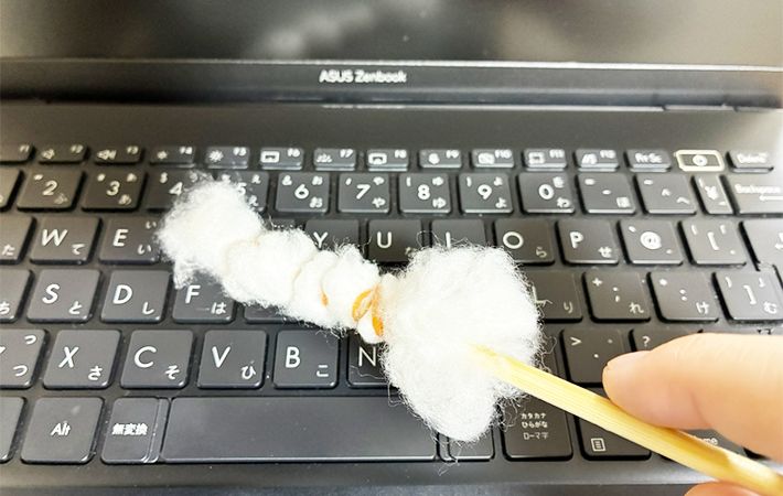 手芸綿で作った『お掃除棒』は、キーボードの掃除にもうってつけ。