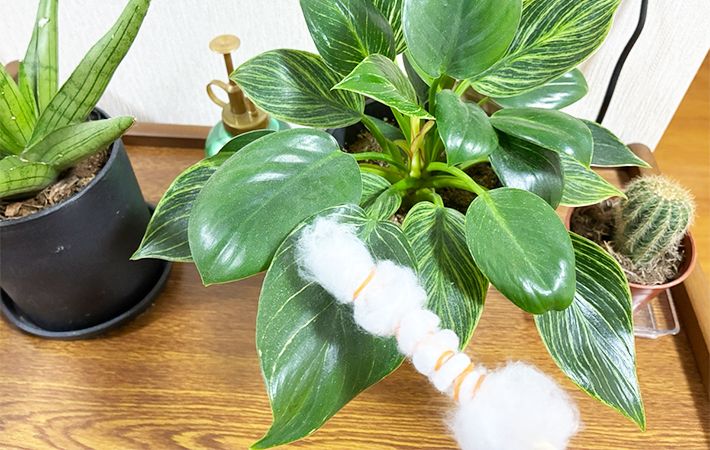 そんな時にも、綿で作った『お掃除棒』が役立ちます。『お掃除棒』で優しくなぞれば、葉を痛めることなく汚れを拭き取ることができますよ。
