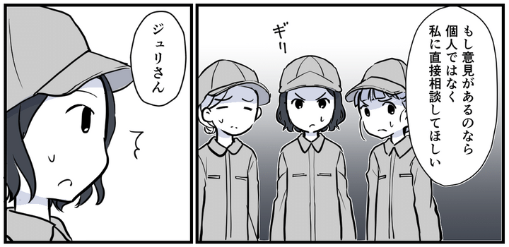キヨカさんは全体へ向けて、もし意見や不満がある場合は個人ではなく上司である自分に直接相談してほしいと、部署のメンバーに呼びかけてくれました。