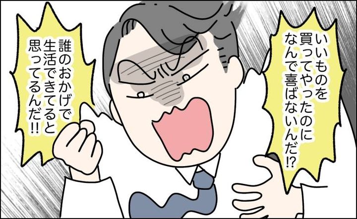 夫はAや子どもたちがプレゼントに対して微妙な反応をしたとしても、まったく気付かない鈍感タイプ。しかし、そのときばかりは違和感を持ったようです。ドヤ顔がみるみるうちに曇っていきます。そして怒りを爆発させました。