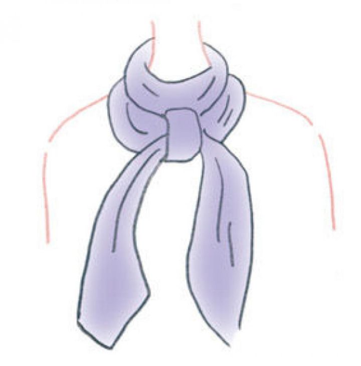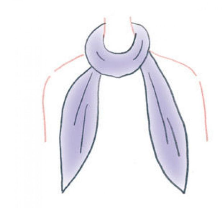 【1】バイアス折り(※1)にしたスカーフの中心を首に合わせ、 ひと巻きして前にもってくる。