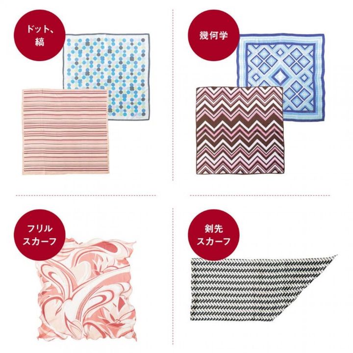 また、シャープな剣先スカーフや フェミニンなフリルスカーフなど、デザインにも注目してみましょう。