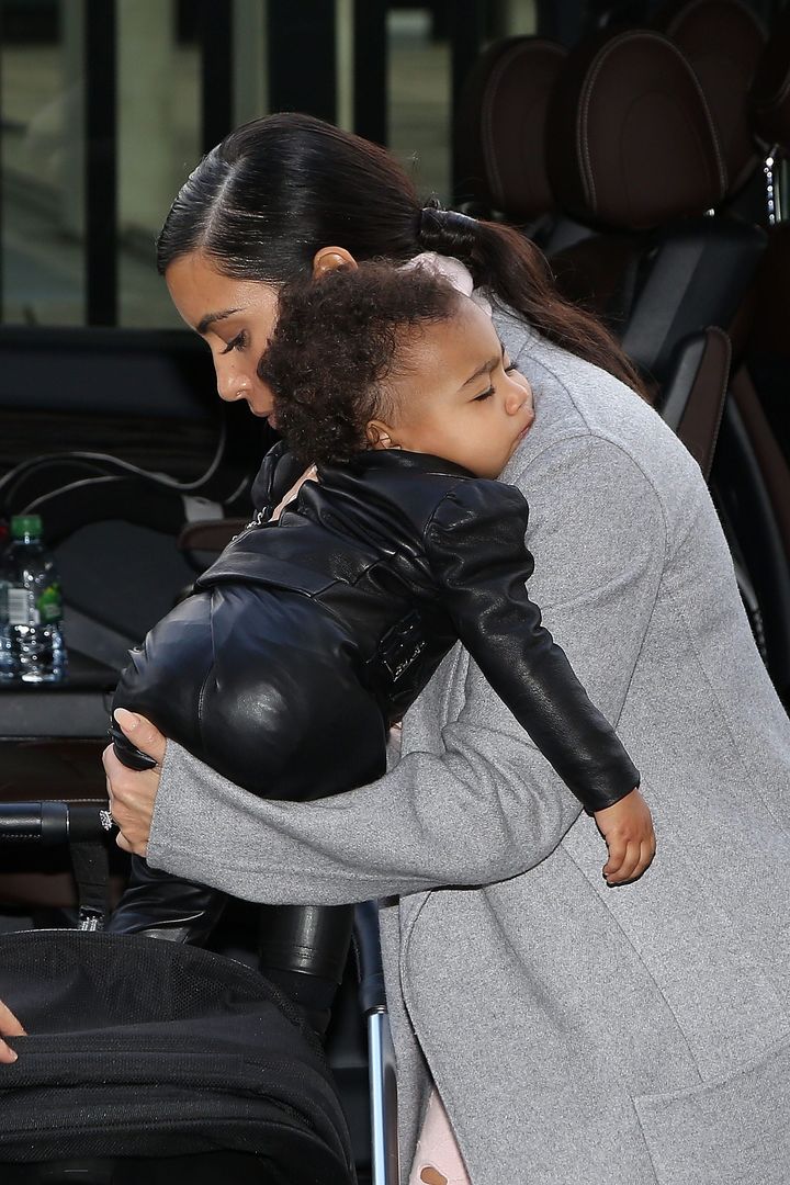 仏シャルル・ド・ゴール空港でオールレザーの装いで、キムに抱かれて寝ている姿をキャッチ。小さな背中がキュート。