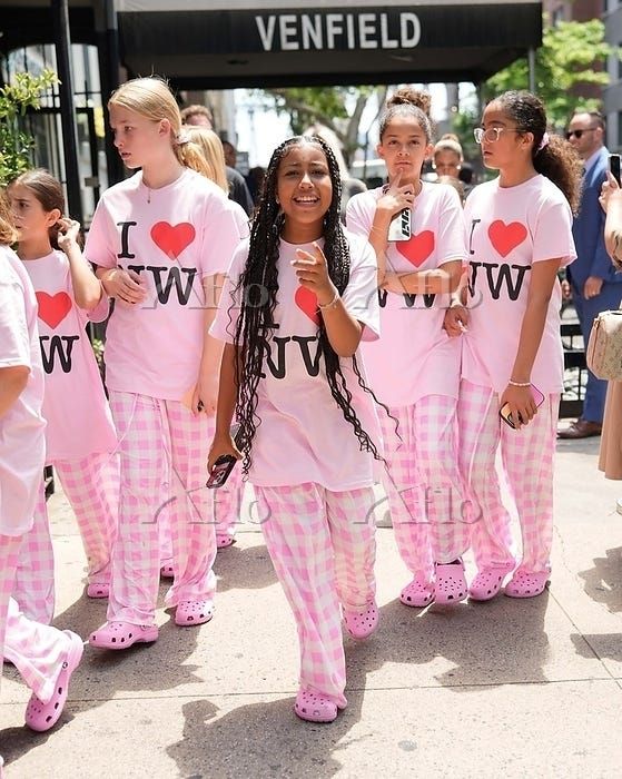 ノース11歳の誕生日を祝って、友人たちも一緒にお揃いのピンクの「I Love NW」パジャマでNYの街へ。