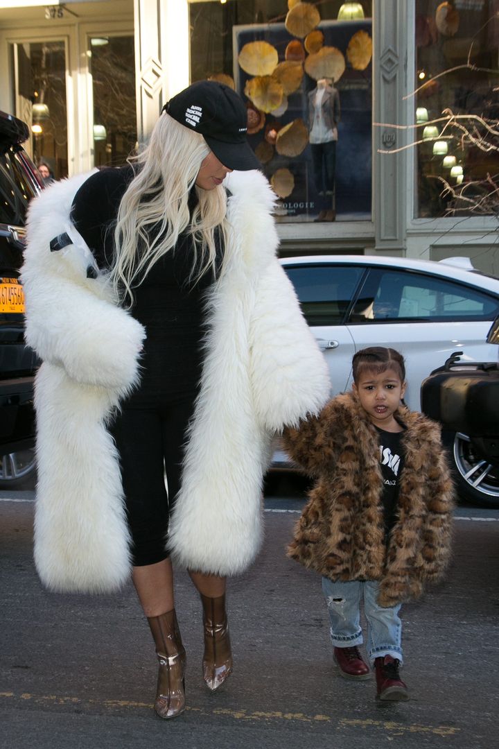 カニエ&ノース親子をNYでパパラッチ。ノースはレザー風上下セットアップにツインテールヘア。
